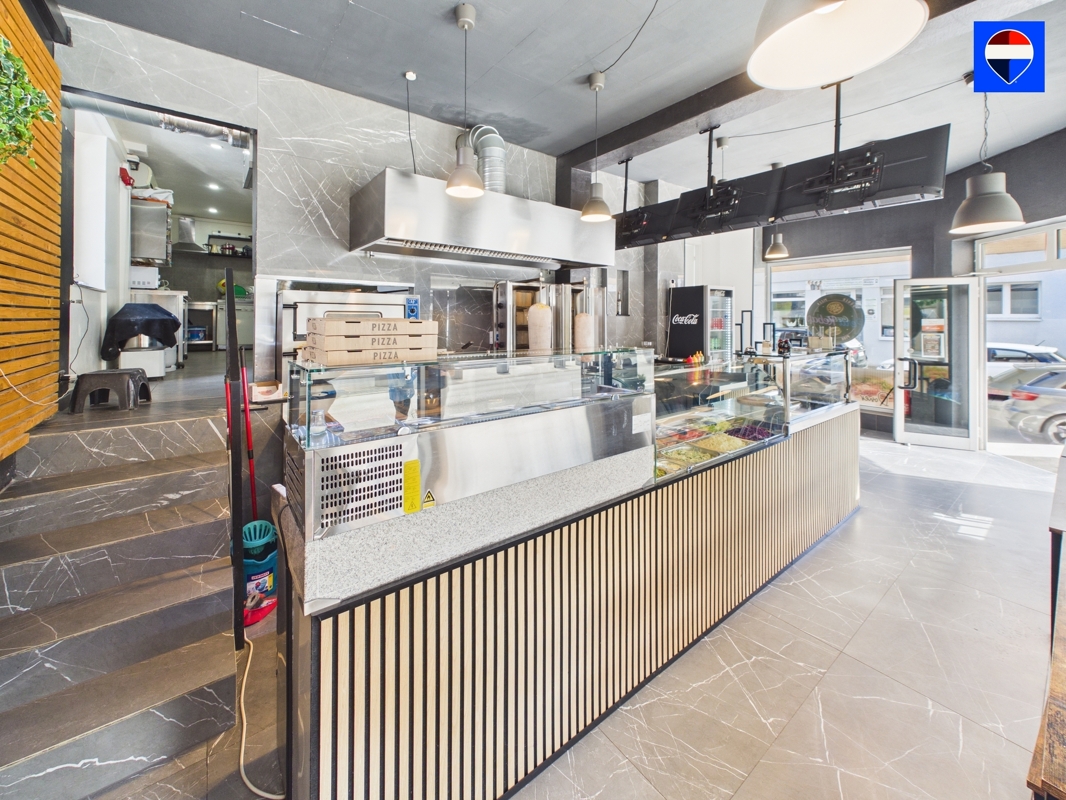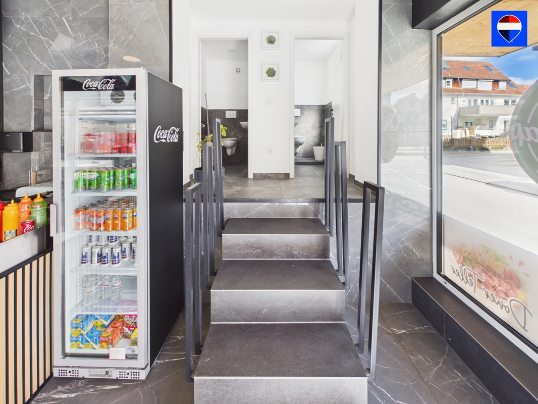 Im Erdgeschoss befindet sich die Gewerbeeinheit, die aktuell als Döner-Imbiss genutzt wird. Die Fläche ist funktional ausgestattet und verfügt über eine separate Küche, ein Personal-WC sowie zwei zusätzliche Gäste-WCs. Dadurch ist die Einheit optimal für gastronomische Nutzung oder andere gewerbliche Konzepte geeignet.