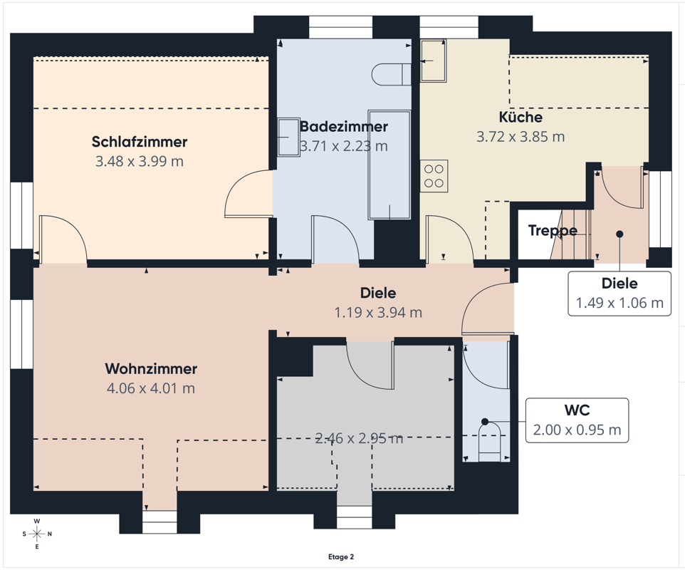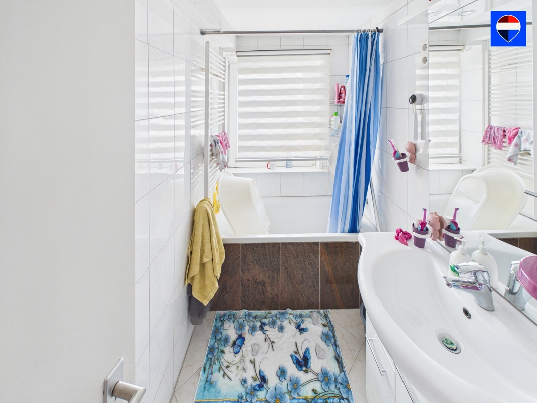 Eine weitere 3-Zimmer-Wohnung mit ca. 58 m² Wohnfläche befindet sich ebenfalls im Obergeschoss. Diese Wohnung verfügt über ein Badezimmer mit Badewanne und WC sowie ein zusätzliches separates WC, was zusätzlichen Komfort bietet.