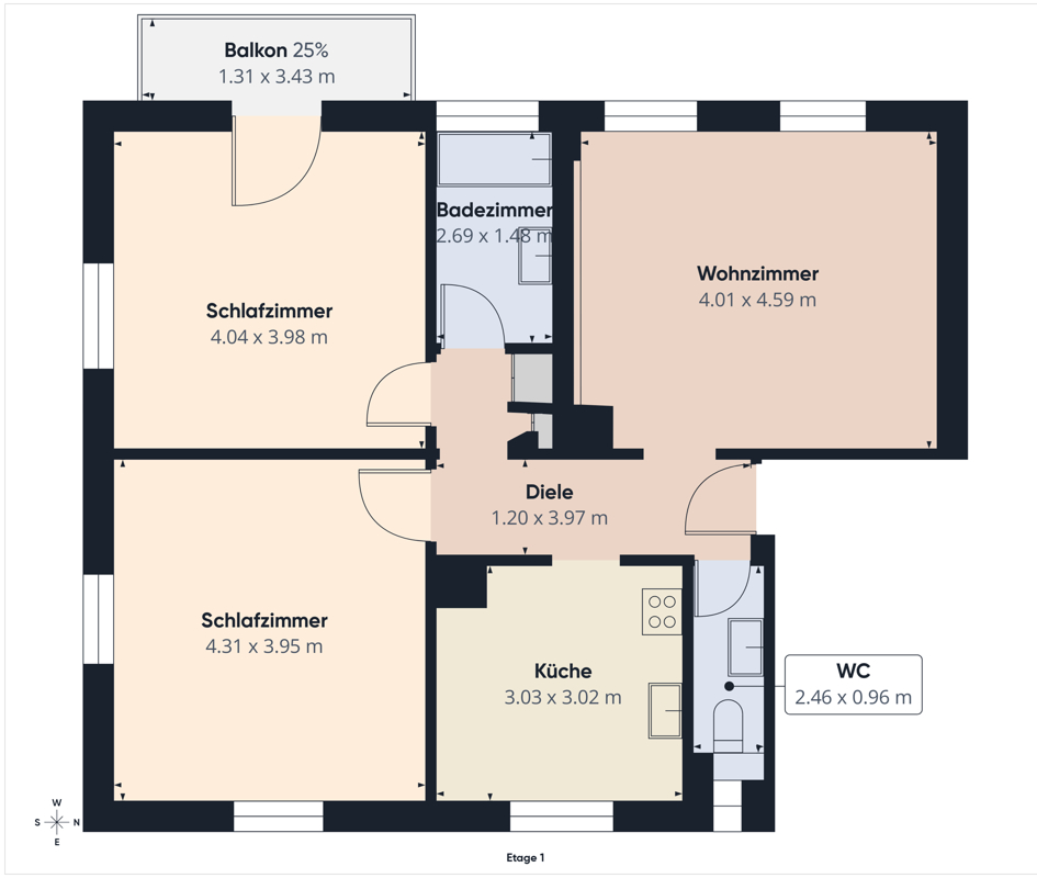 Im 1. Obergeschoss befindet sich eine großzügige 3-Zimmer-Wohnung mit ca. 74 m² Wohnfläche. Die Wohnung verfügt über einen Balkon, ein Badezimmer mit Badewanne sowie ein separates WC. Die durchdachte Raumaufteilung sorgt für eine angenehme Wohnatmosphäre und eine gute Vermietbarkeit.